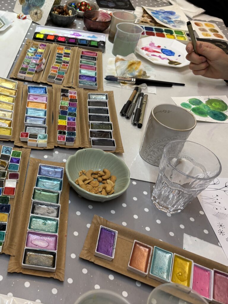 Es stehen dir verschiedenste Aquarellfarben, Pinsel, Papier, Fineliner, sowie eine Ideensammlung an Doodles zur Verfügung.