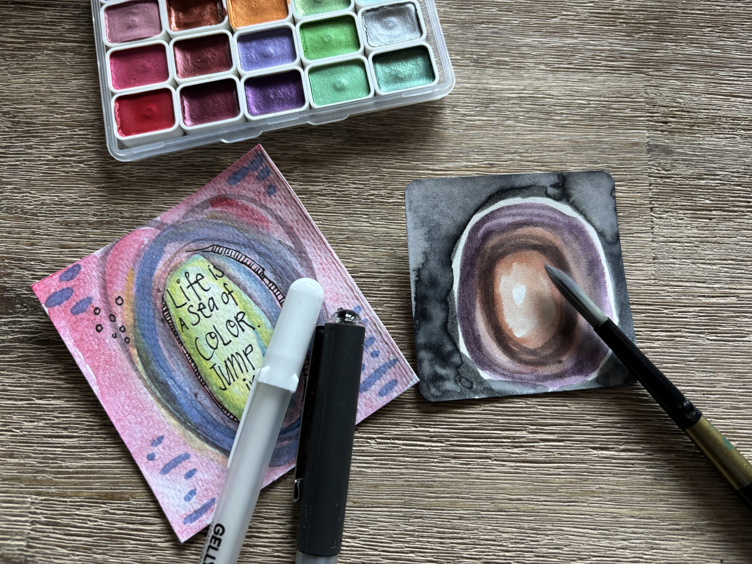 Wir arbeiten mit Aquarellfarben und setzen mit Fineliner feine Akzente, Muster oder Schriftzüge darüber. So entstehen individuelle, ausdrucksstarke Karten.